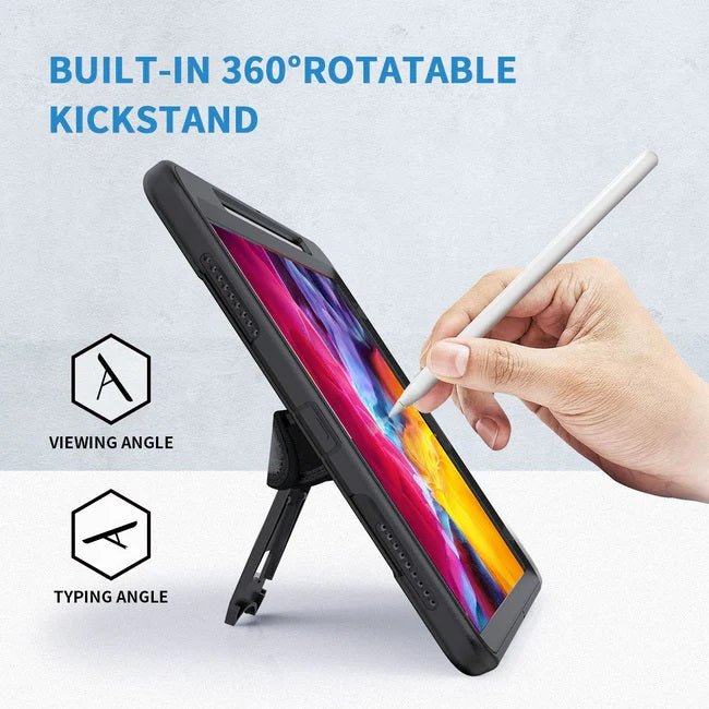 Apple iPad 9th Gen case built-in bracket and turntable. Pick a perfect angle that you want. For watching videos, conferences, typing, and drawing. Ideal for office workers,students, parents, or children.