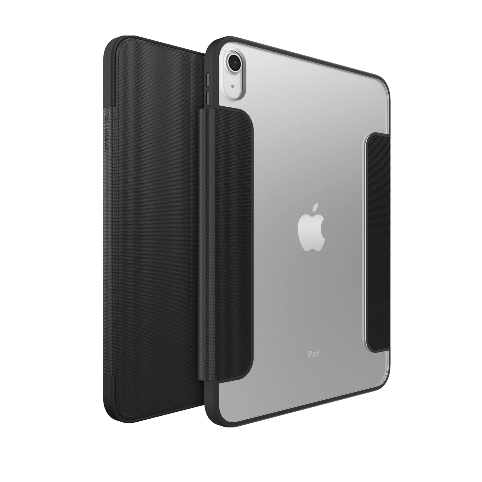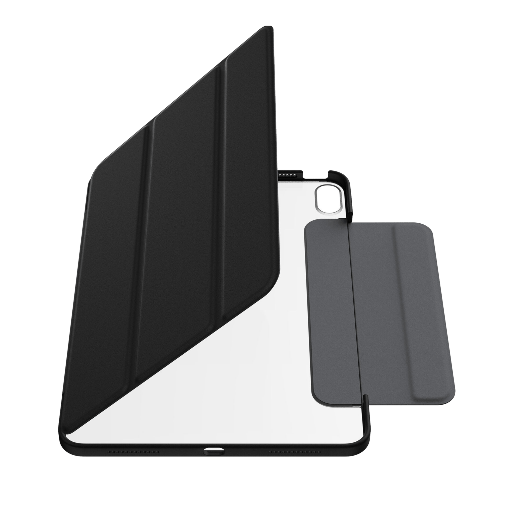 Shown on iPad (10th generation). Clear folio iPad Air 11-inch (M3) and iPad Air 11-inch (M2) case protects against drops and scratches and converts into multiple positions for hands-free typing and viewing. The folio’s microfiber lining guards the screen and holds tight with magnets, which also activate sleep/wake modes for quick-start functionality and battery preservation